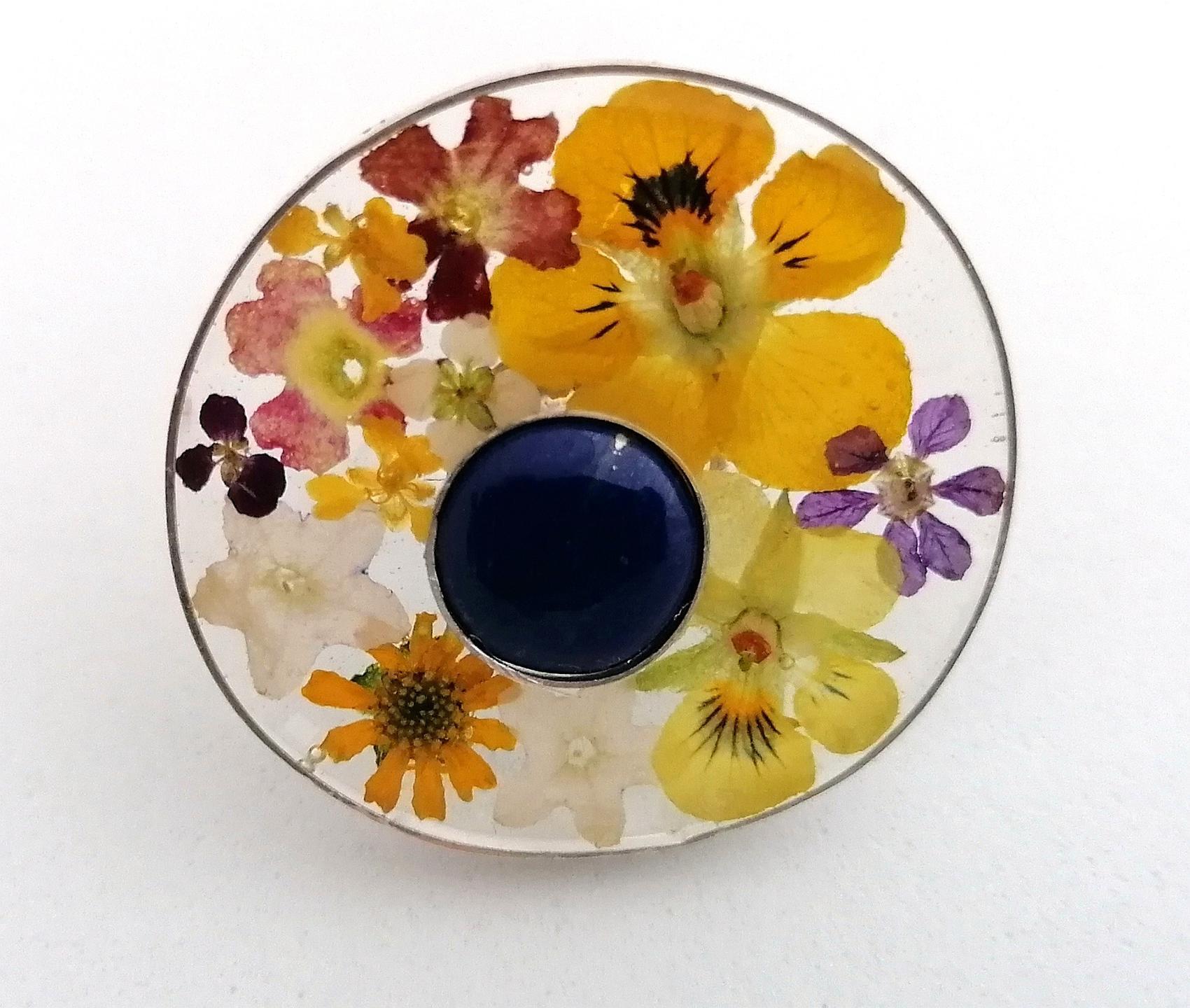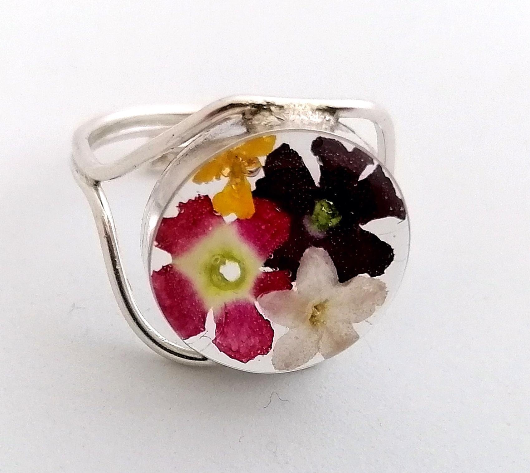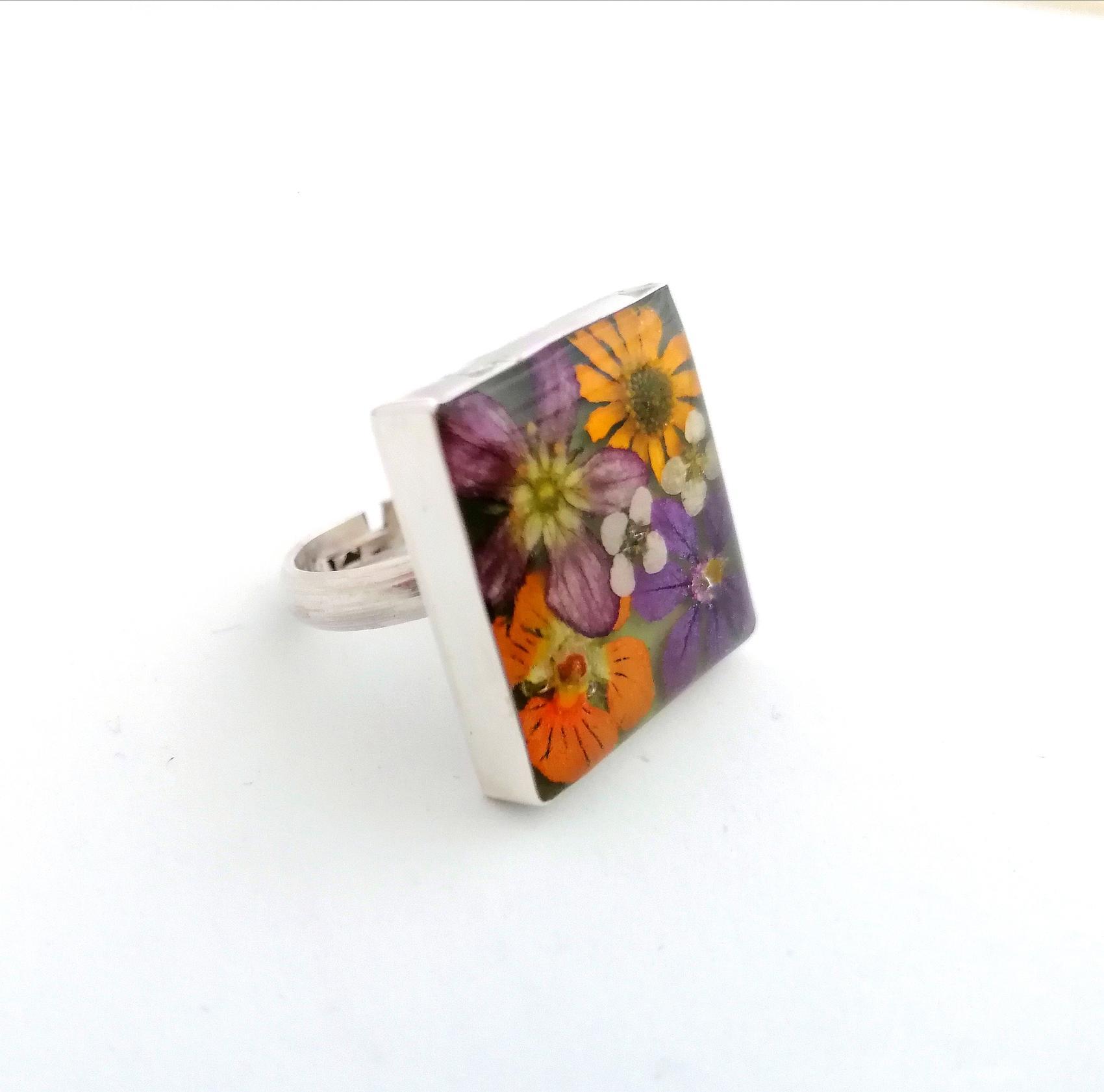 Anillo con flores naturales, resina, esmalte y plata de ley