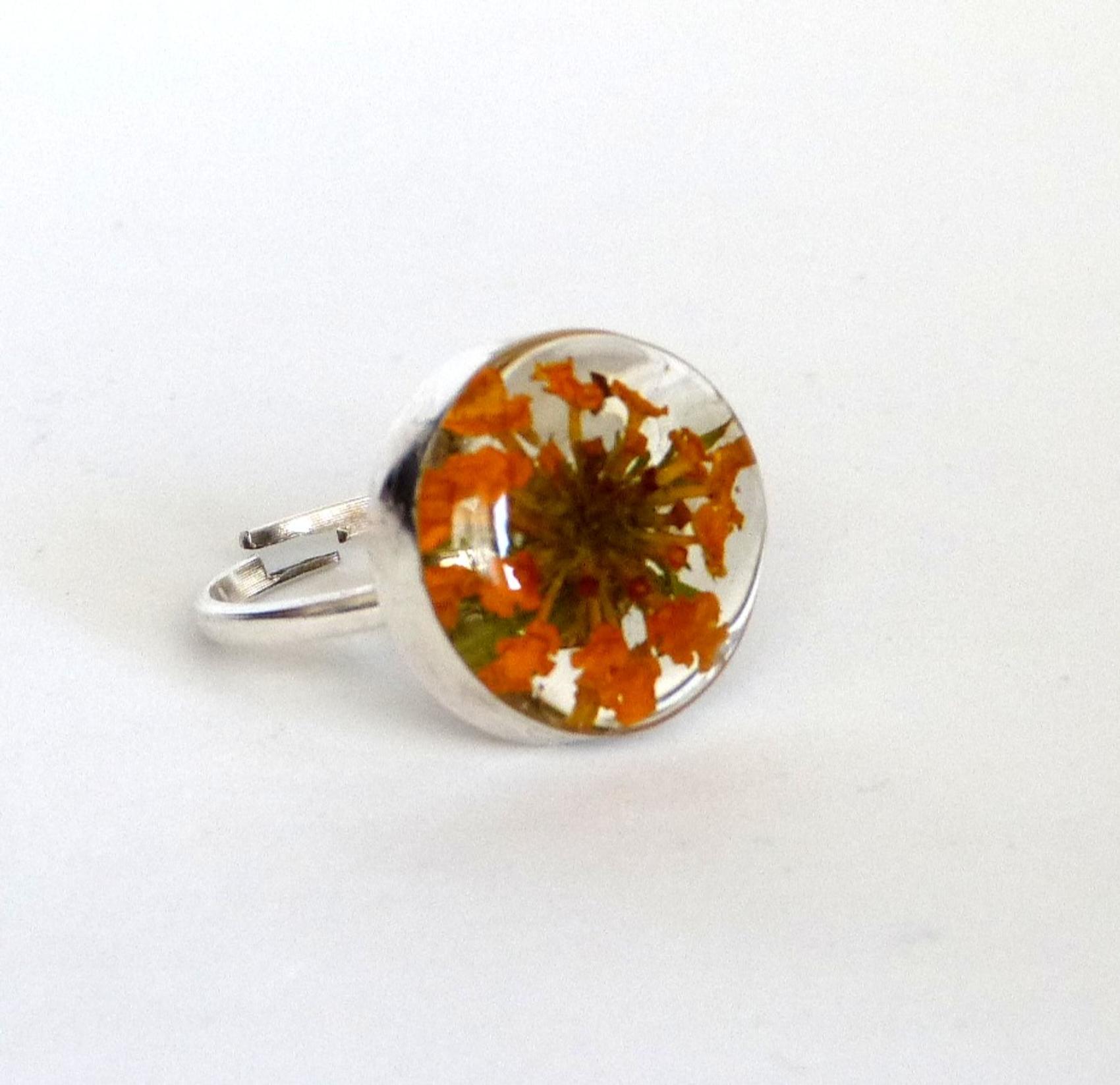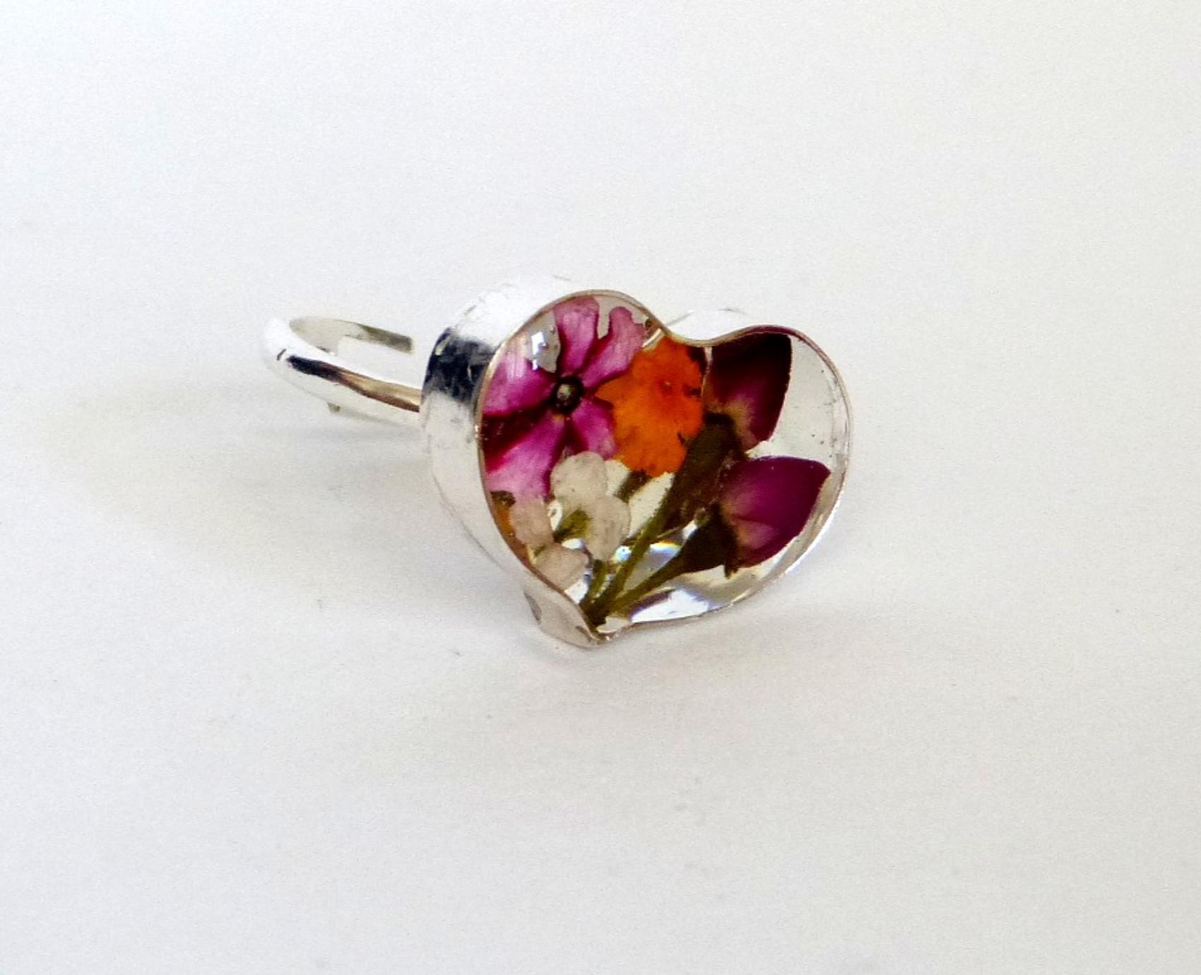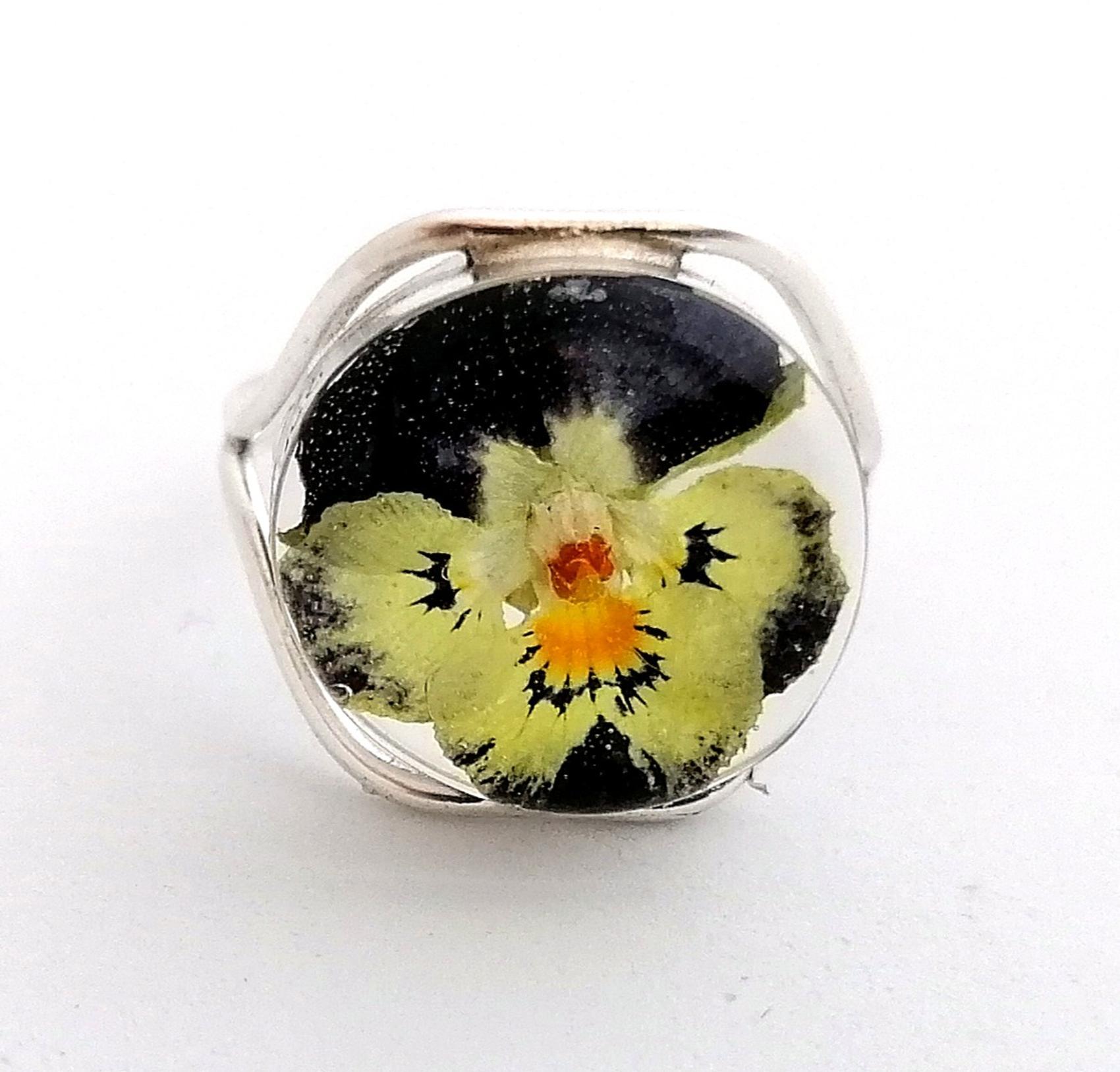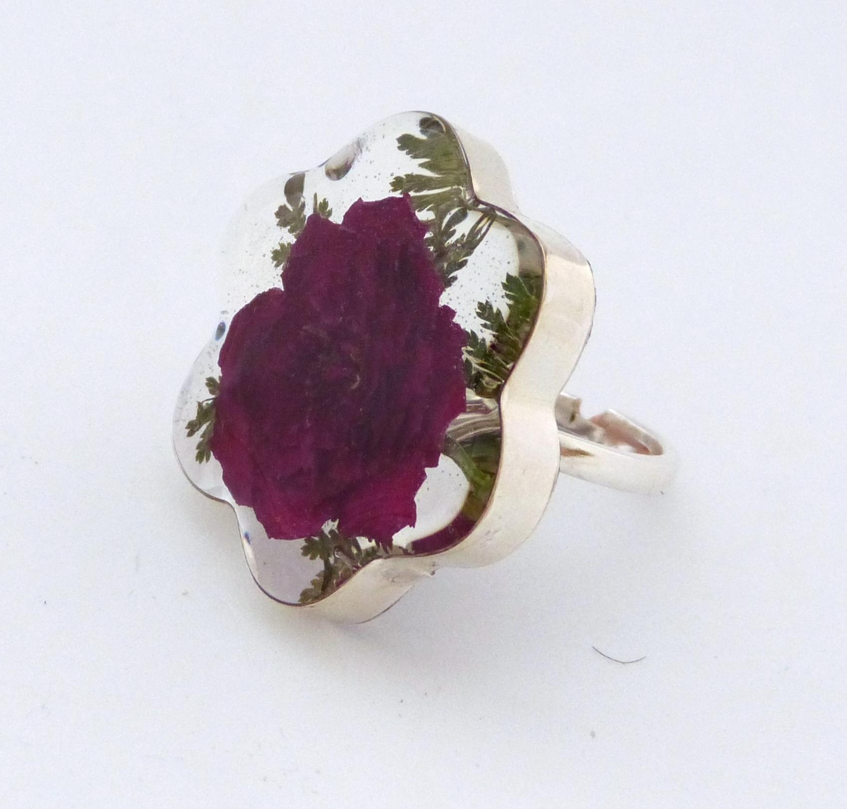 Anillo con flores naturales, resina, esmalte y plata de ley